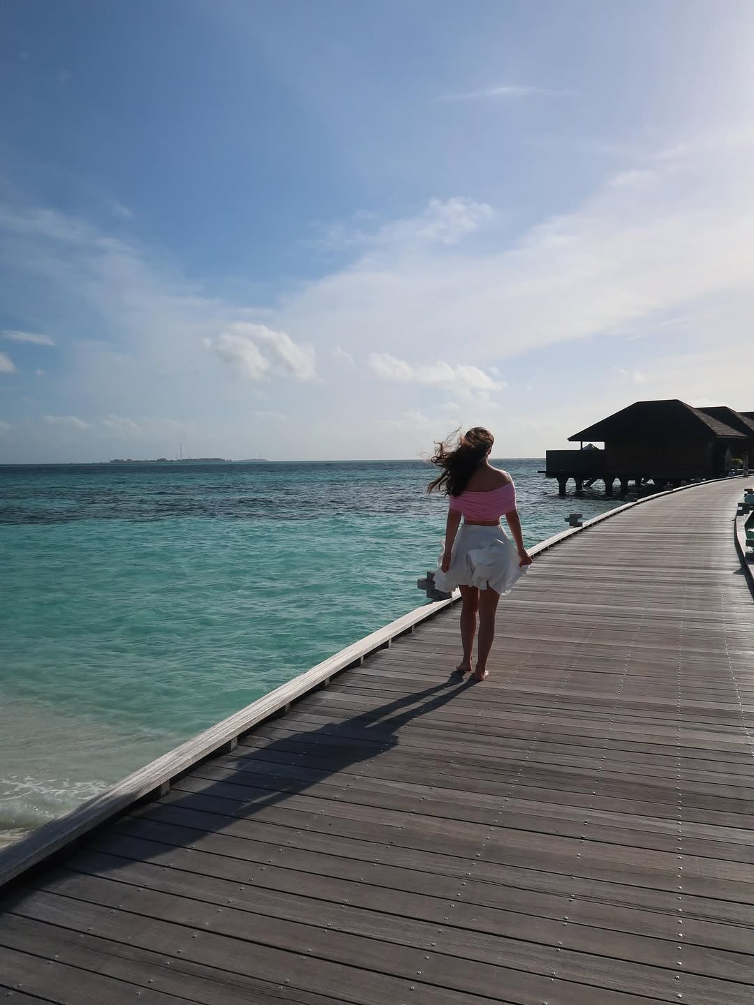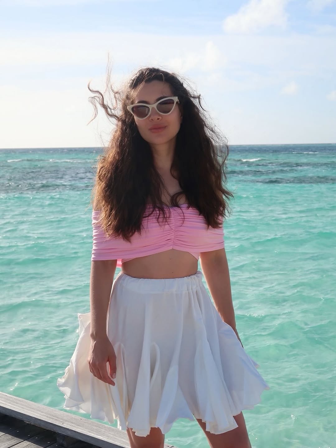 На фотографиях журналистка позирует на фоне водоема в белой юбке и розовом топе.