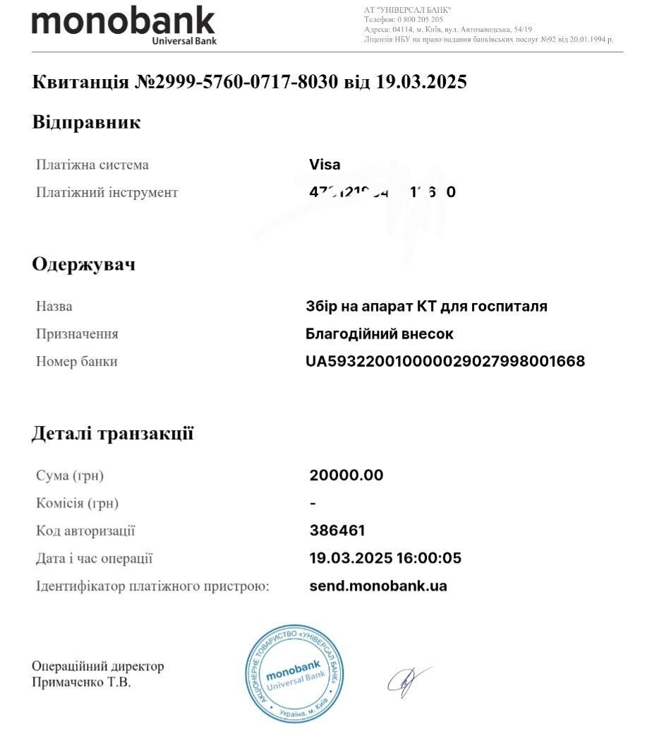 Аверьянова перевела 20 тыс. грн на покупку томографа.