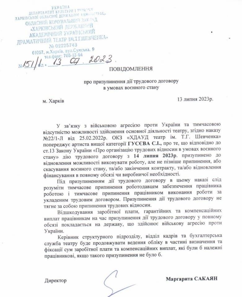 Актер Харьковского государственного академического украинского драматического театра имени Тараса Шевченко "Березіль" Сергей Гусев 13 июля опубликовал фото документа, в котором сообщается, что руководство театра приостанавливает действие трудового договора "из-за военной агрессии России, а возмещение заработной платы возлагает на государство-агрессор".