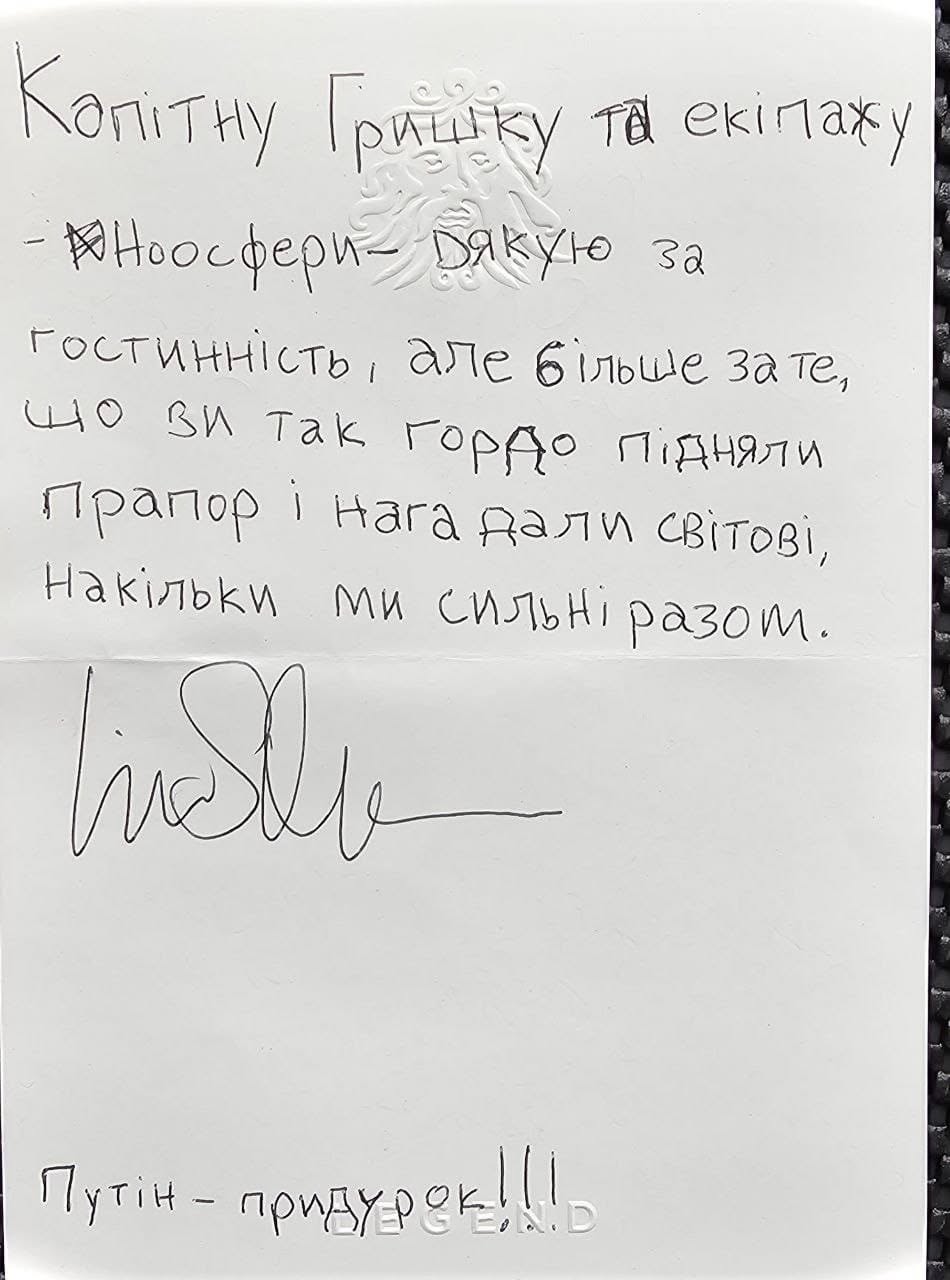 В память о своем визите актер оставил записку на украинском языке, где коротко написал все, что думает о Путине.