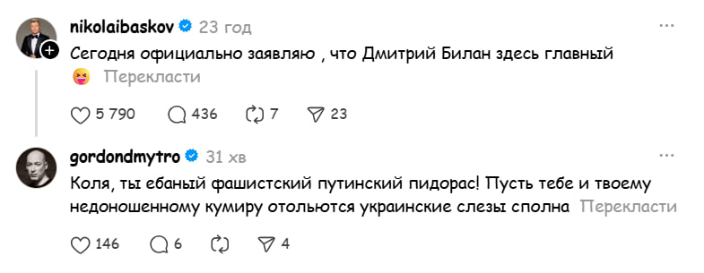 Украинский журналист, основатель интернет-издания "ГОРДОН" Дмитрий Гордон отреагировал на свежий пост российского пропагандиста и исполнителя песен Николая Баскова, который тот разместил 1 апреля в соцсети Threads.