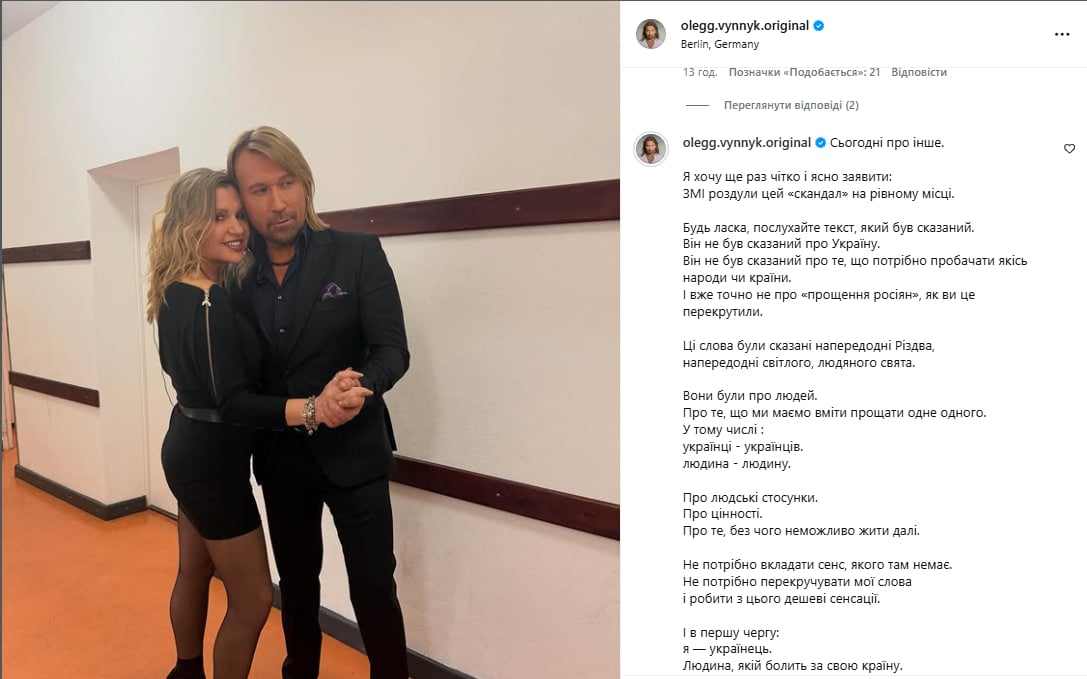 Сбежавший за границу в начале полномасштабной войны украинский исполнитель песен Олег Винник 24 декабря в комментарии к своему новому посту оправдался за то, что на одном из своих последних концертов призывал украинцев прощать российских оккупантов.