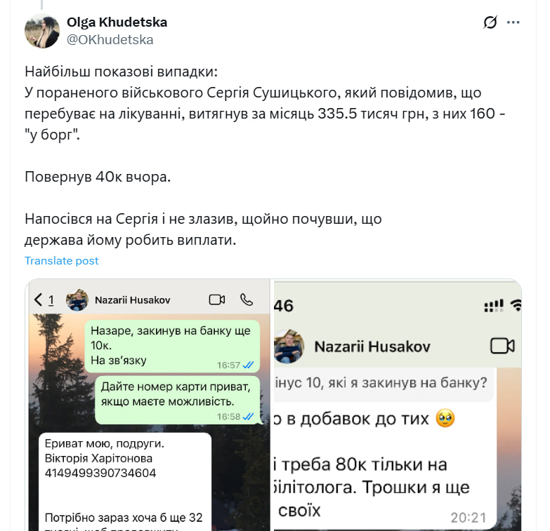 По словам Худецкой, Гусаков выманил у раненого военного, который был на лечении, 335,5 тыс. грн. Из них 160 тыс. обещал вернуть, но вернул только 40 тыс. 20 июня после огласки.