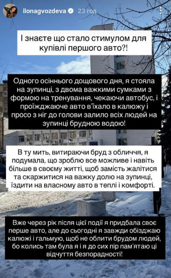 "Знаете, что стало стимулом для покупки первого авто? Одним осенним дождливым днем я стояла на остановке с двумя тяжелыми сумками с формой на тренировку, ожидая автобус. И проезжающее авто въехало в лужу и просто с ног до головы залило всех людей на остановке грязной водой", – рассказала она.