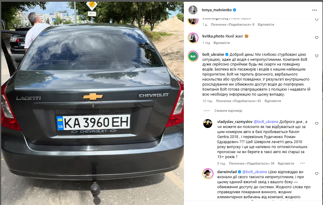 "Компания Bolt очень серьезно воспринимает какие-либо жалобы на поведение водителей. Безопасность всех пассажиров и водителей является нашим высоким приоритетом. Bolt не терпит физического, вербального насилия или грубого поведения", – говорится в посте.
