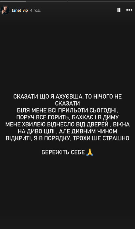 "Сказать, что я ох...евшая – это ничего не сказать. Возле меня прилет сегодня. Рядом все горит, грохочет и в дыму, – написала Песик. – Меня волной отнесло от двери".
