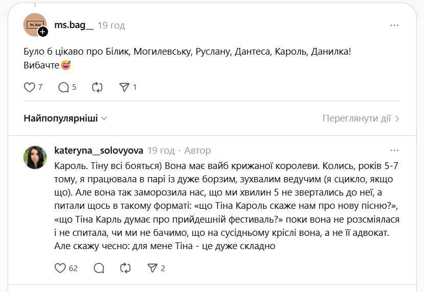 Соловьева предложила подписчикам называть фамилии артистов, которые им интересны, и рассказывала о каждом из них свое впечатление. Радиоведущая в том числе высказалась и об украинской певице Тине Кароль.