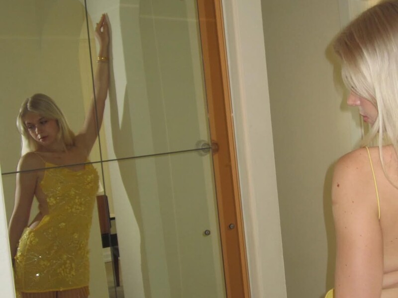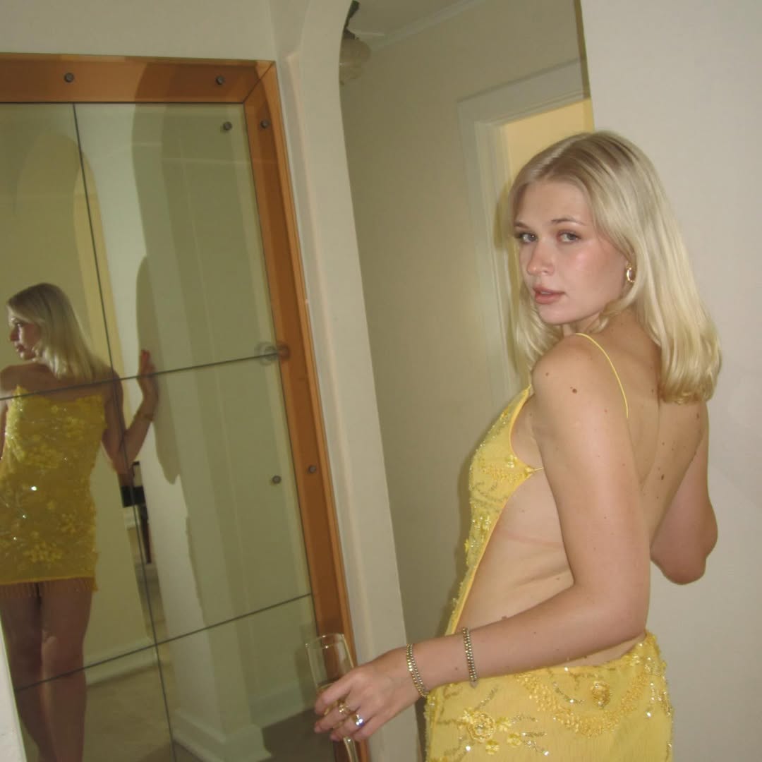 Киперман позировала в желтом платье с пайетками. Она выбрала модель с открытой спиной и глубокими вырезами по бокам.