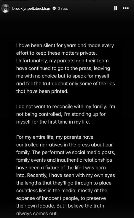 "Я молчал годами, старясь сохранить все в тайне. К сожалению, мои родители не оставили мне иного выбора, кроме как рассказать правду, – написал он. – Я не хочу мириться со своей семьей. Я впервые в жизни отстаиваю свои права. Всю свою жизнь мои родители контролировали освещение в прессе событий, касающихся нашей семьи. Показательные посты в социальных сетях, семейные мероприятия и неискренние отношения были неотъемлемой частью моей жизни с рождения".