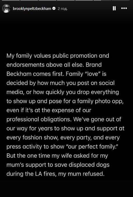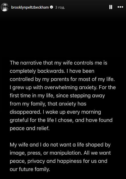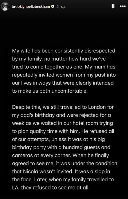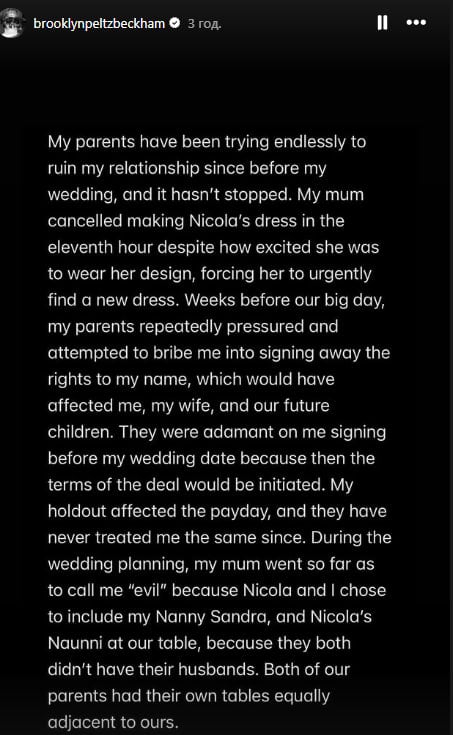 Во втором посте сын Бекхэмов заявил, что родители хотят разрушить его брак с американской актрисой Николой Пельтц – дочерью американского миллиардера Нельсона Пельтца.