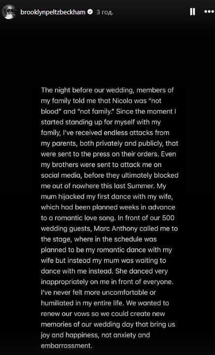 "Моя мама неоднократно приглашала женщин из моего прошлого, явно с целью вызвать у нас обоих дискомфорт. Несмотря на это, мы все же поехали в Лондон на день рождения моего отца, и целую неделю нам отказывали, пока мы ждали в номере отеля, пытаясь организовать с ним время. Он отвергал все наши попытки, за исключением его грандиозной вечеринки по случаю дня рождения со 100 гостями и камерами на каждом углу. Когда он наконец согласился увидеться со мной, то при условии, что Никола не будет приглашена. Это было как пощечина. Позже, когда моя семья поехала в Лос-Анджелес, они вообще отказались меня видеть", – рассказал 26-летний Бруклин Бекхэм.