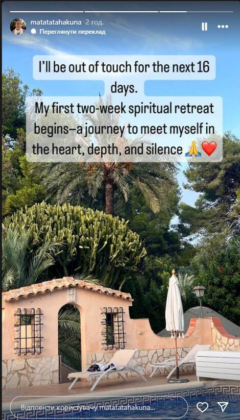 "Я не буду на связи в течение следующих 16 дней. Начинается мой первый двухнедельный духовный ретрит – путешествие ко встрече с собой в сердце, глубине и тишине", – написала дочь Мозговой.