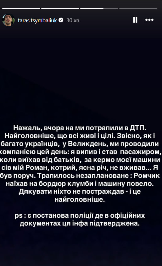 "Я выпил и стал пассажиром". Тарас Цимбалюк после ДТП заявил, что за рулем был его друг