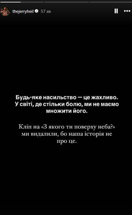 "Любое насилие – это ужасно, – написала певица. – В мире, где столько боли, мы не имеем права приумножать его. Клип на "З якого ти поверху неба" мы удалили, потому что наша история не об этом".