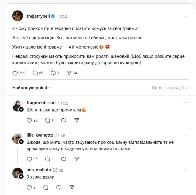 Украинская певица Jerry Heil после тяжелых периодов в жизни пишет об этом песню. Свое заявление артистка разместила в соцсети Threads 18 сентября.
