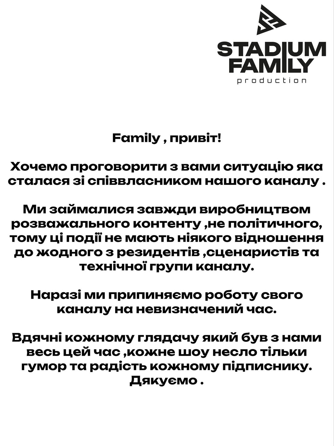 "Хотим проговорить с вами ситуацию, которая произошла с совладельцем нашего канала. Мы занимались всегда производством развлекательного контента, не политического, поэтому эти события не имеют никакого отношения ни к одному из резидентов, сценаристов и технической группы канала", – говорится в публикации.