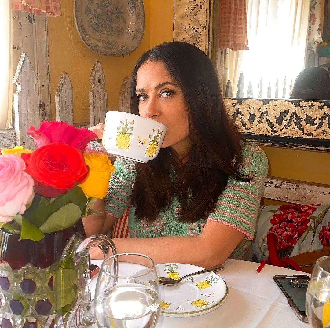 Хайек позировала сидя и держа в руке объемную чашку с изображением ананасов. На столе перед актрисой стоит яркий букет роз и бокал с водой.
