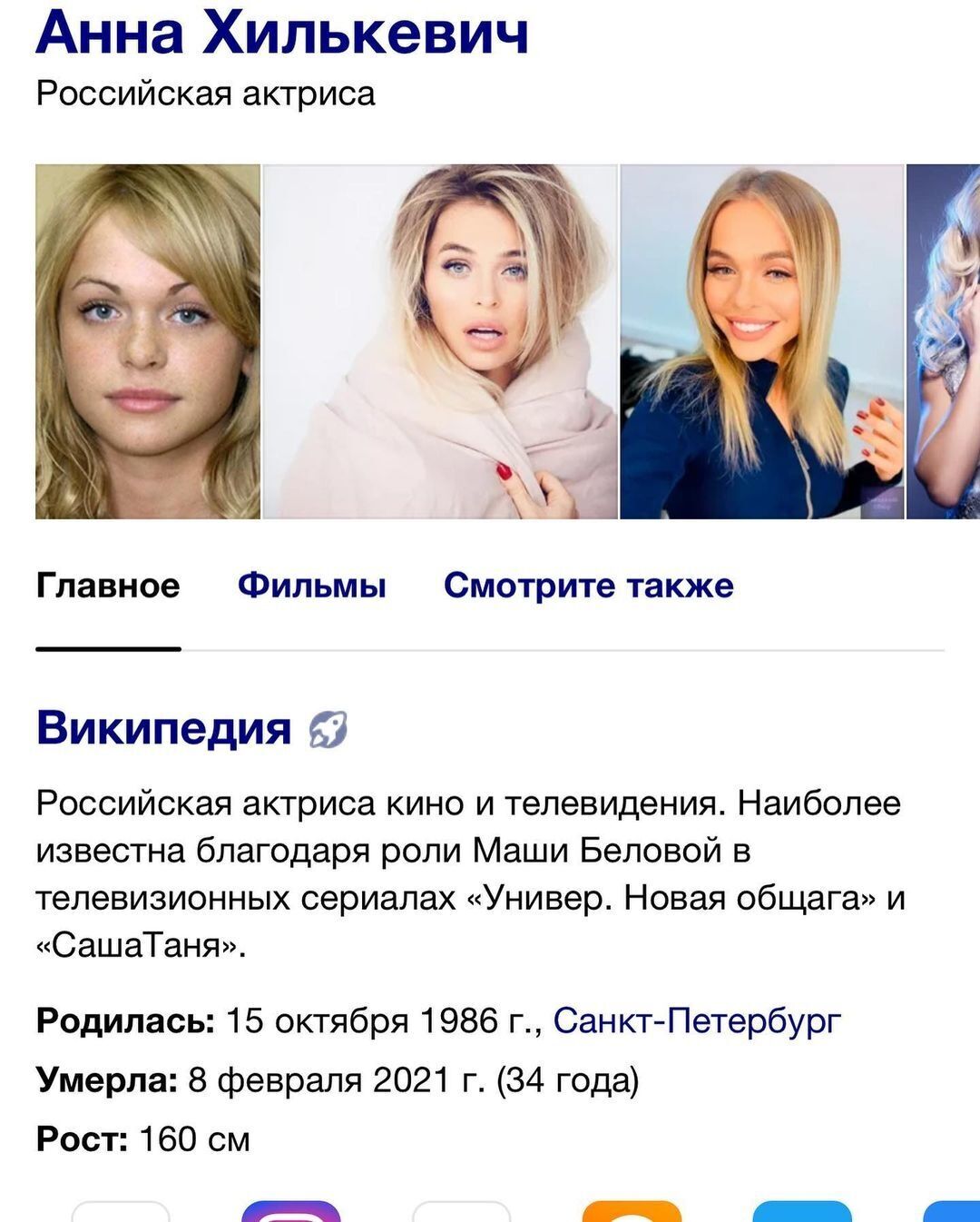 Российская "Википедия" указала на странице российской актрисы Анны Хилькевич, что она умерла 8 февраля 2021 года. Артистка узнала об этом от своих подписчиков.