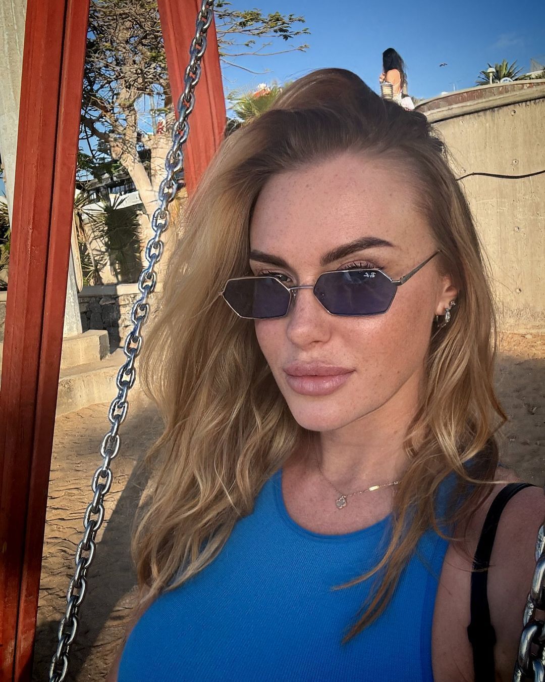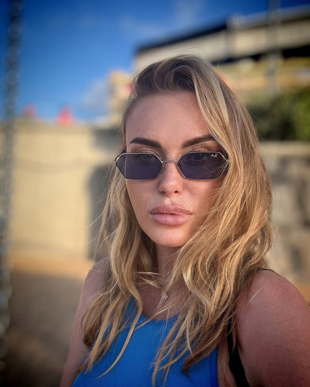 Каминская снялась в голубом топе и солнцезащитных очках. Она предстала с распущенными волосами и светлой блестящей помадой на губах.
