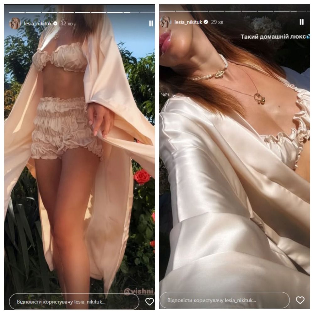 На одном из фото Никитюк позирует с нижнего ракурса, демонстрируя в кадре длинные стройные ноги. На другом она крупным планом показала свой топ.