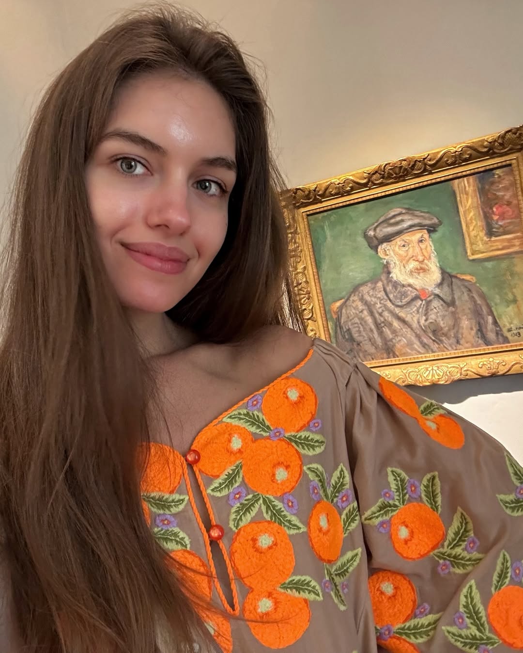Кучеренко предстала в бежевом платье-вышиванке с цветами оранжевого цвета.