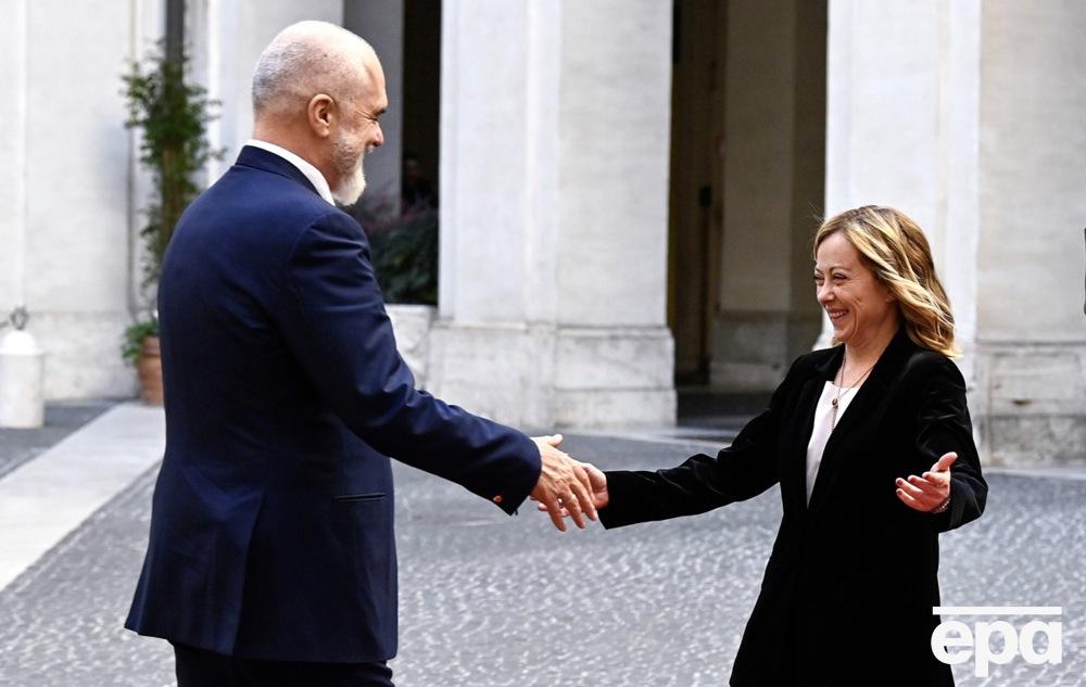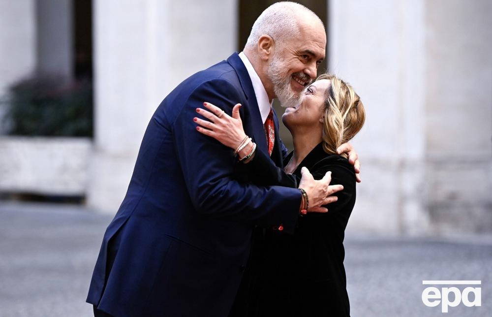 Премьер-министр Албании Эди Рама при встрече с премьер-министром Италии Джорджей Мелони не скрывает своей симпатии к ней – он уже дважды публично становился перед итальянским политиком на одно колено, а во время приветствия энергично обнимался и целовался в щеку.