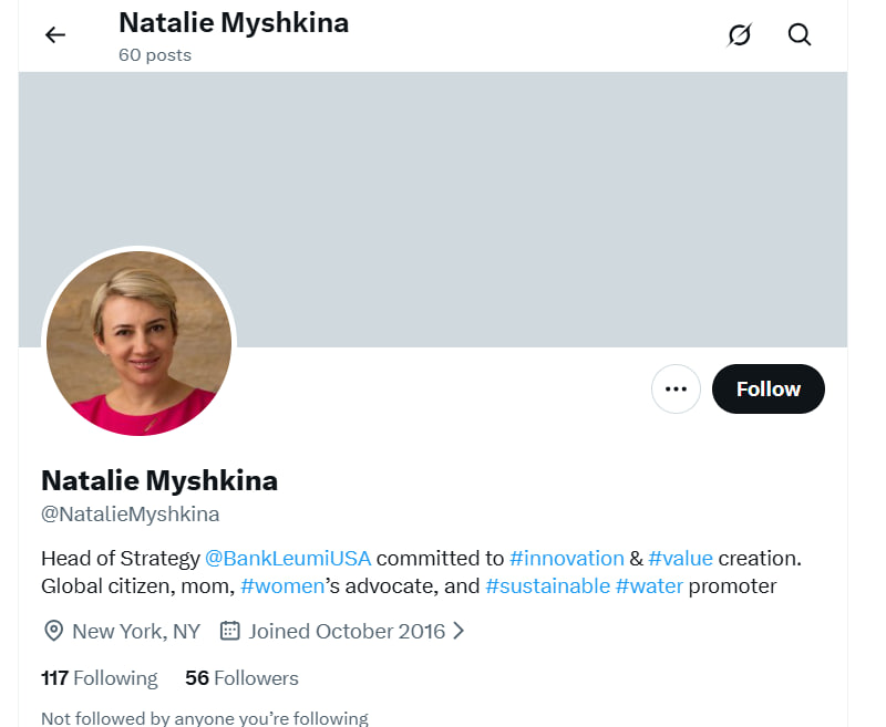 У Мышкиной есть страница соцсети X, где отмечено, что в "Банке Леуми" она занимала должность руководителя отдела стратегий.