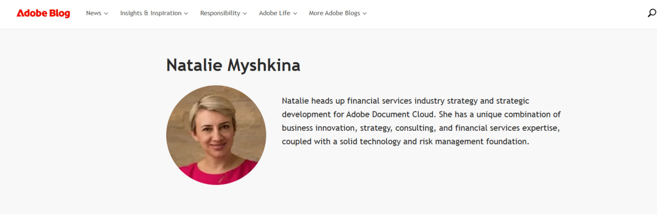На сайте Adobe указано, что Мышкина возглавляет отдел стратегии и стратегического развития в сфере финансовых услуг в Adobe Document Cloud.