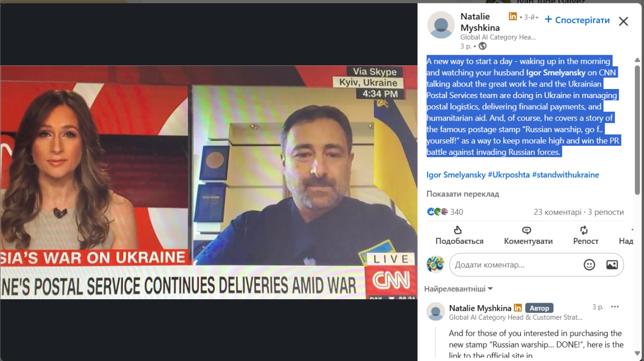 "Новый способ начать день – проснуться утром и увидеть, как муж Игорь Смелянский выступает на CNN и рассказывает о большой работе, которую он и команда "Укрпошти" делают в Украине. Гордость. Благодарность. И невероятное ощущение того, что рядом человек, который вместе со своей командой делает по-настоящему важное дело", – написала она тогда.