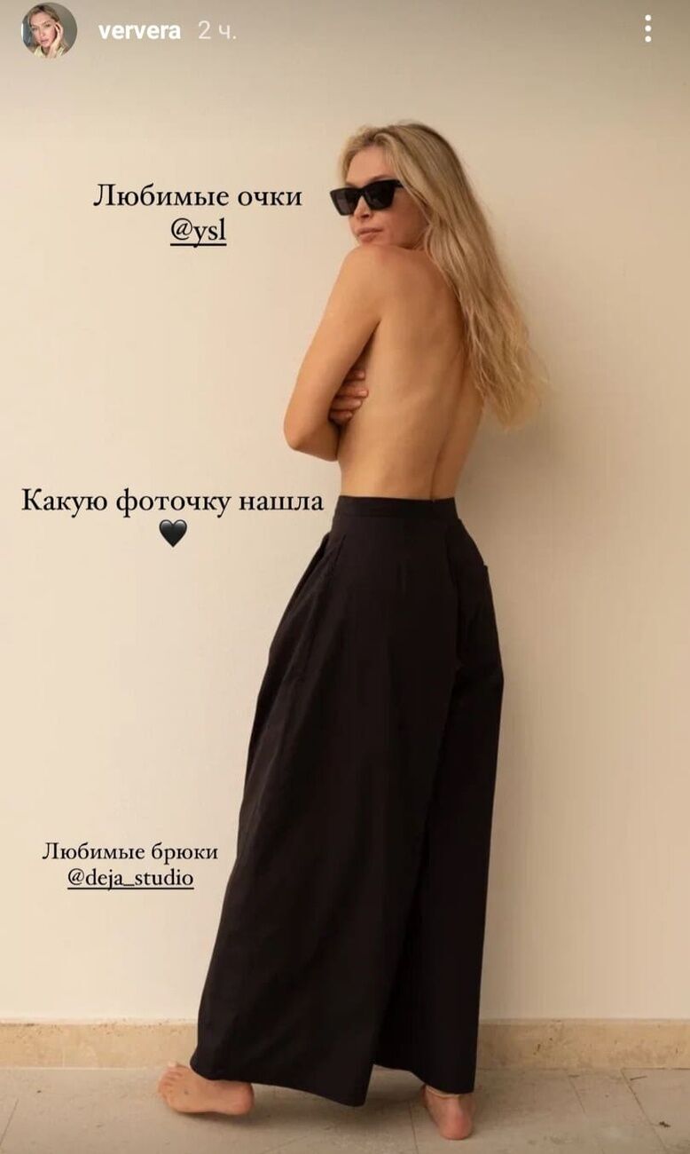 Строящая карьеру в стране-агрессоре России украинская певица Вера Брежнева 27 января разместила в Instagram Srories фото, на котором запечатлена топлес в черных широких брюках и затемненных очках.