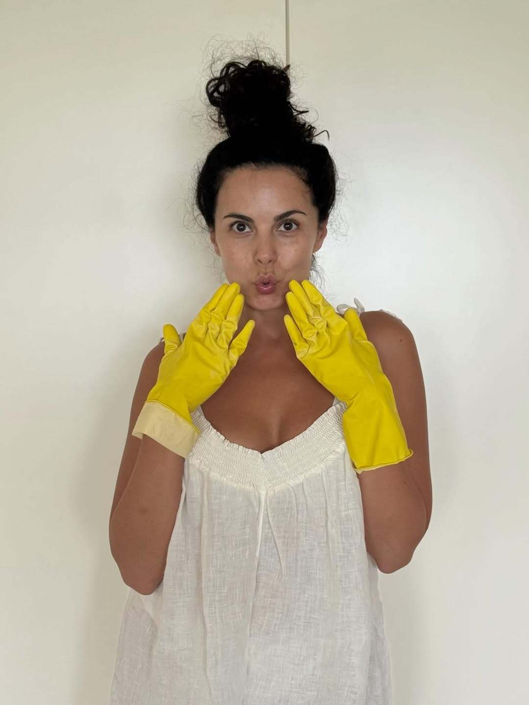 Розовое платье и черные перчатки в домашнем варианте Каменских заменила футболкой и резиновыми перчатками, сложив губы уточкой.