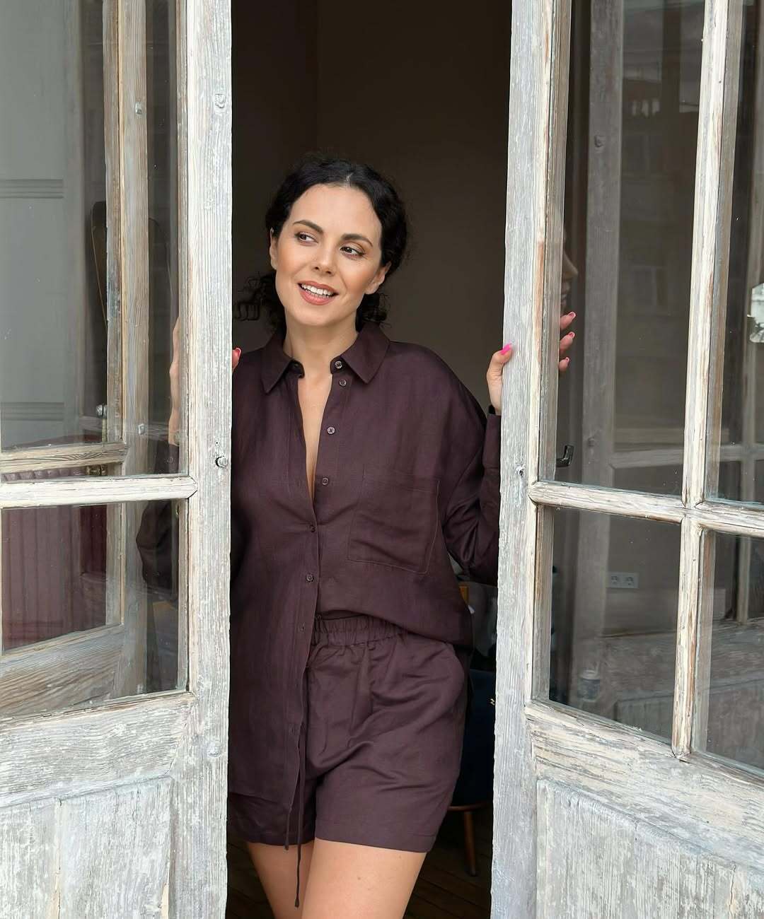 Каменских снялась в рубашке и шортах шоколадного цвета.