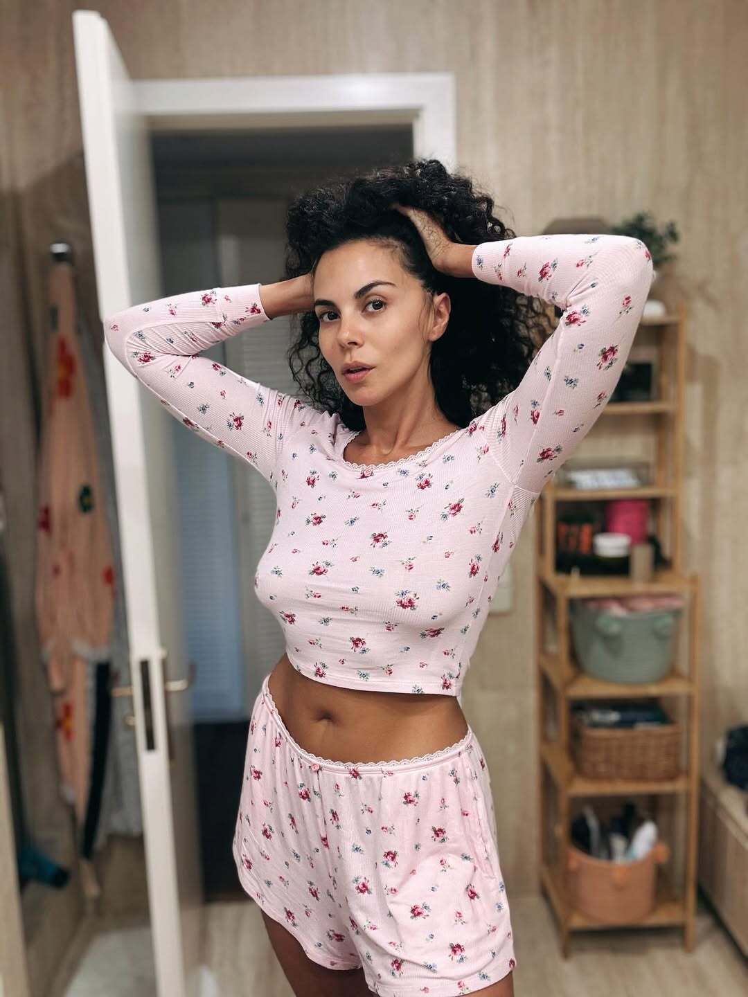 На опубликованном фото артистка позирует в пижаме с поднятыми вверх руками – так, что видно живот.