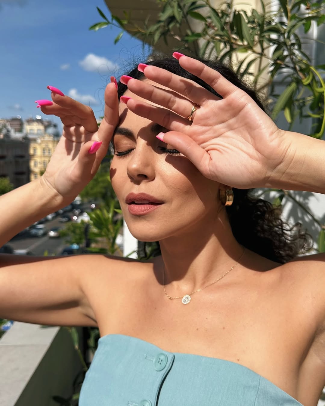 Каменских позировала на балконе в голубом платье без бретелей, с открытыми плечами и пуговицами спереди.