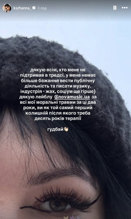 "Индустрия – ужас, социум – еще хуже. "Спасибо" лейблу за все мои моральные травмы за эти два года. Вы как тот самый первый бывший, после которого нужно 10 лет терапии. Гудбай", – написала артистка.