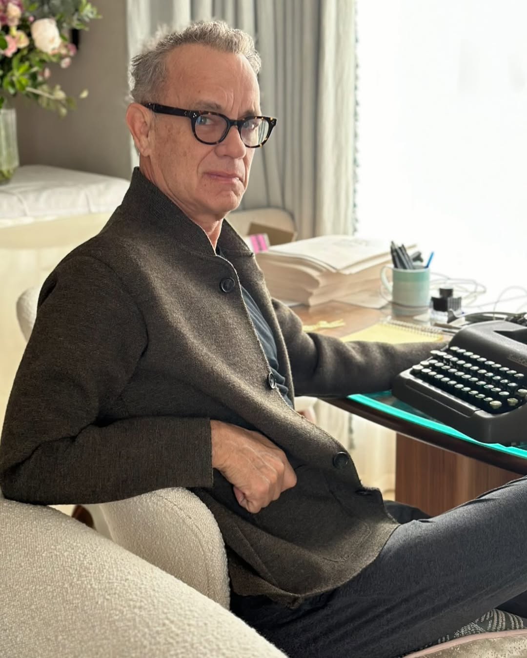 На фотографии Хенкс изображен, сидя за письменным столом возле пишущей машинки. Одет актер в серые брюки и коричневый пиджак. Свой образ он дополнил очками.