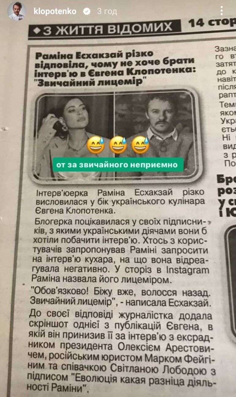 Украинский ресторатор Евгений Клопотенко 27 апреля в Instagram Stories разместил скриншот газетной публикации о том, что украинский блогер Рамина Эсхакзай назвала его "обычным лицемером".