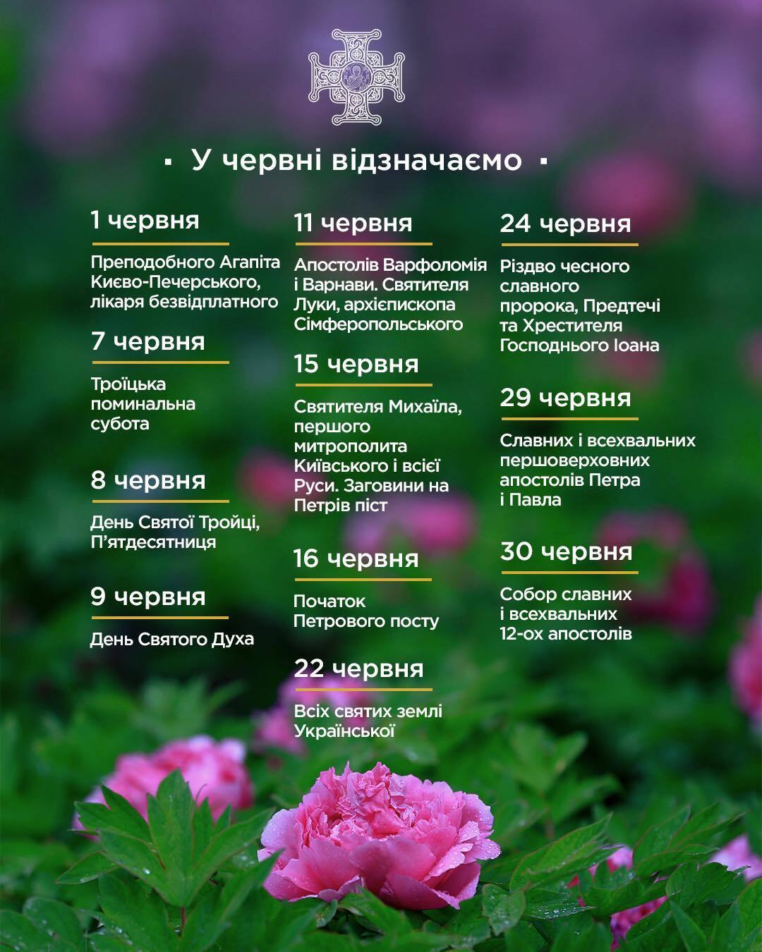 "А 22 июня, во второе воскресенье после Пятидесятницы, будем чтить всех святых земли украинской, – отметили в ПЦУ. – 24 июня – Рождество пророка, Предтечи и Крестителя Господня Иоанна. 29 июня – апостолов Петра и Павла. В последний день июня будем чтить Собор славных и всехвальных 12 апостолов".