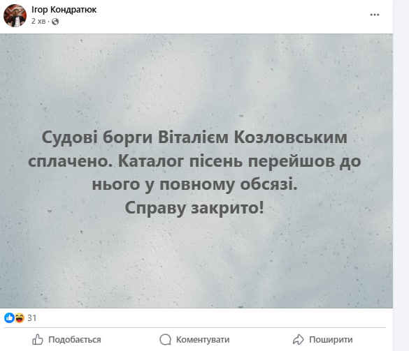"Судебные долги Виталием Козловским погашены. Каталог песен перешел к нему в полном объеме. Дело закрыто", – написал Кондратюк.