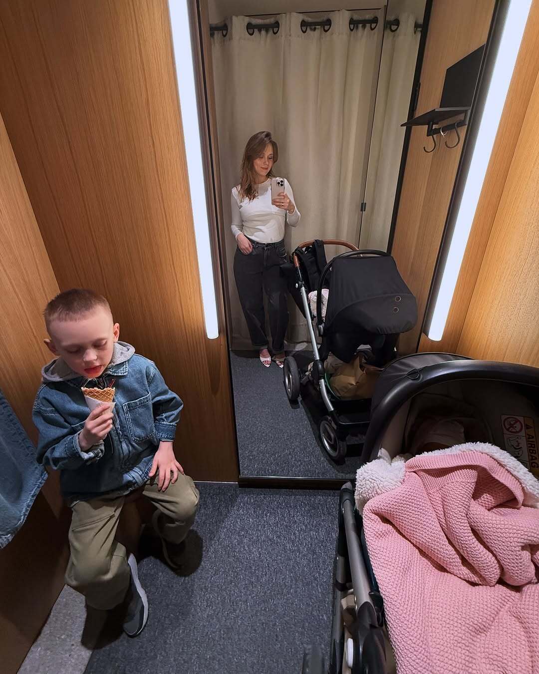 Кошмал на фото зафиксирована рядом с шестилетним сыном Михаилом и коляской, в которой лежит рожденная 13 марта дочь София.
