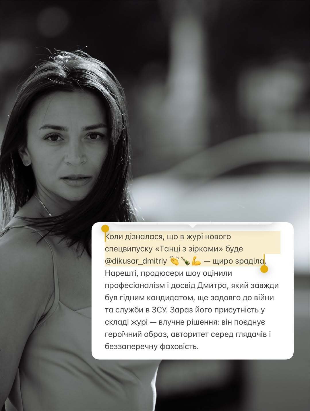 "Наконец-то продюсеры оценили профессионализм и опыт Дмитрия, который всегда был достойным кандидатом, еще задолго до войны, до службы в ВСУ, – написала она. – Сейчас его присутствие в жюри – удачное решение: он сочетает героический образ, авторитет среди зрителей и профессионализм".