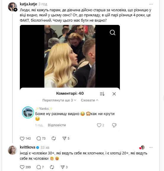 27-летняя Квиткова старше своего 23-летнего жениха на четыре года. Пользователи сети решили обсудить эту тему публично, выставив их совместное фото.