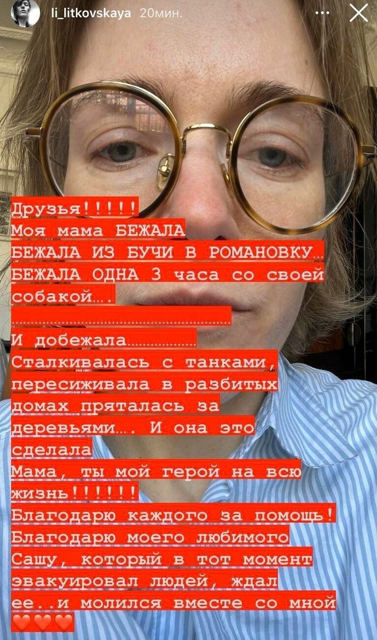 "Моя мама бежала из Бучи в Романовку. Бежала одна три часа со своей собакой. И добежала. Сталкиваясь с танками, пересиживала в разбитых домах, пряталась за деревьями. И она это сделала. Мама, ты мой герой на всю жизнь!" – написала Литковская.
