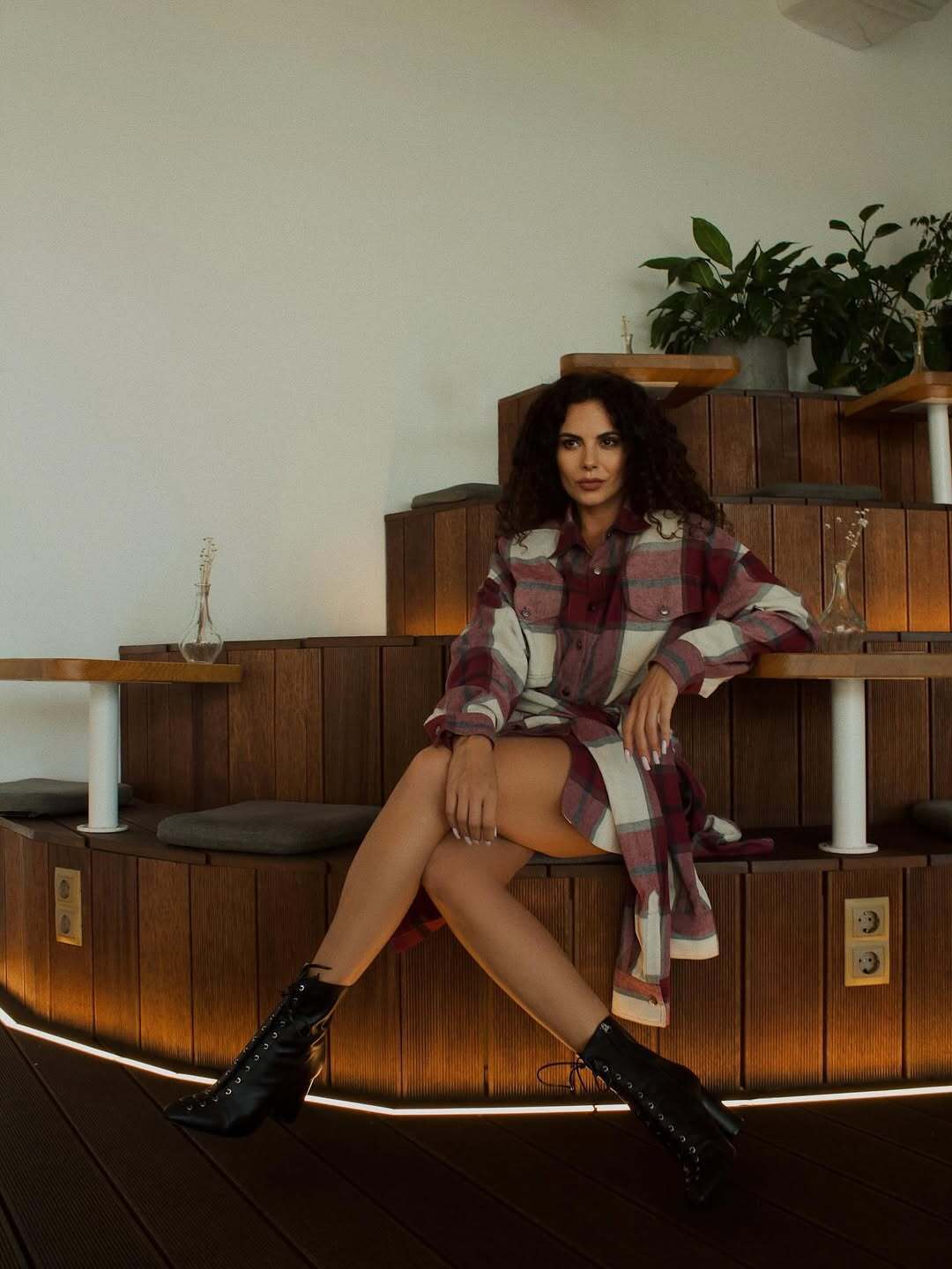 Певица снялась в клетчатом платье-рубашке и ботильонах, демонстрируя ноги. Она позировала, сидя на лестнице.