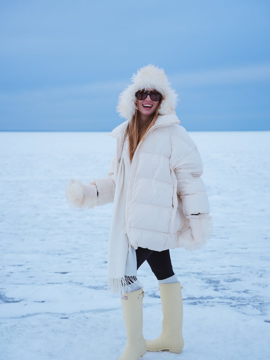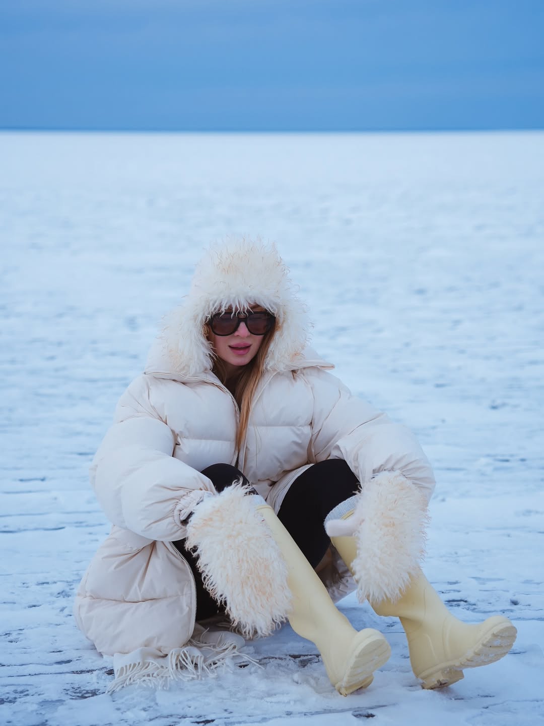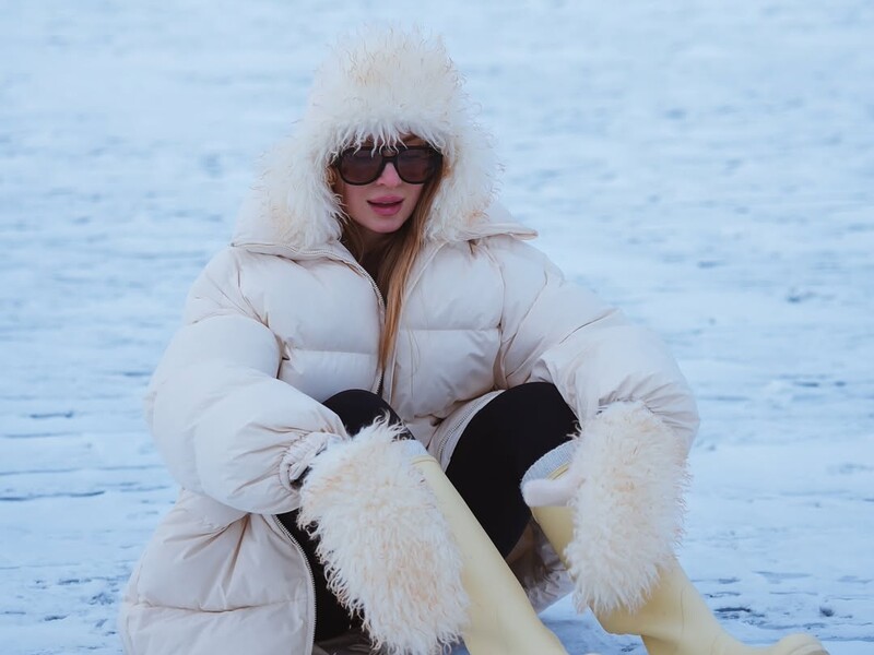 Она снялась в белом пуховике и шапке-ушанке, черных лосинах и белых сапогах.