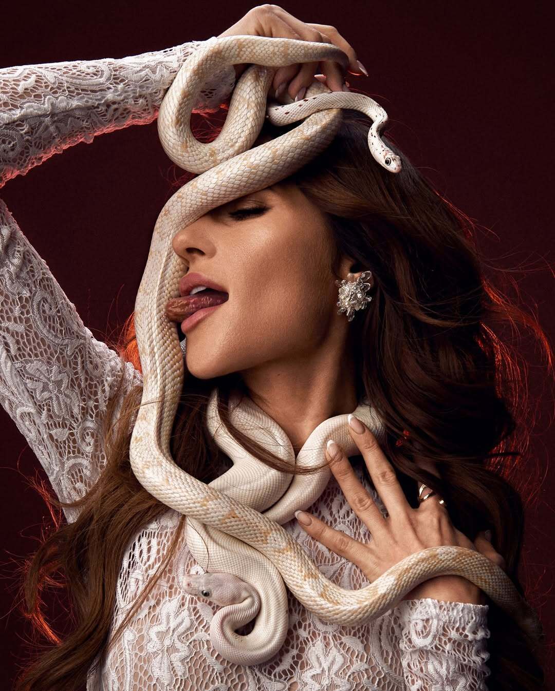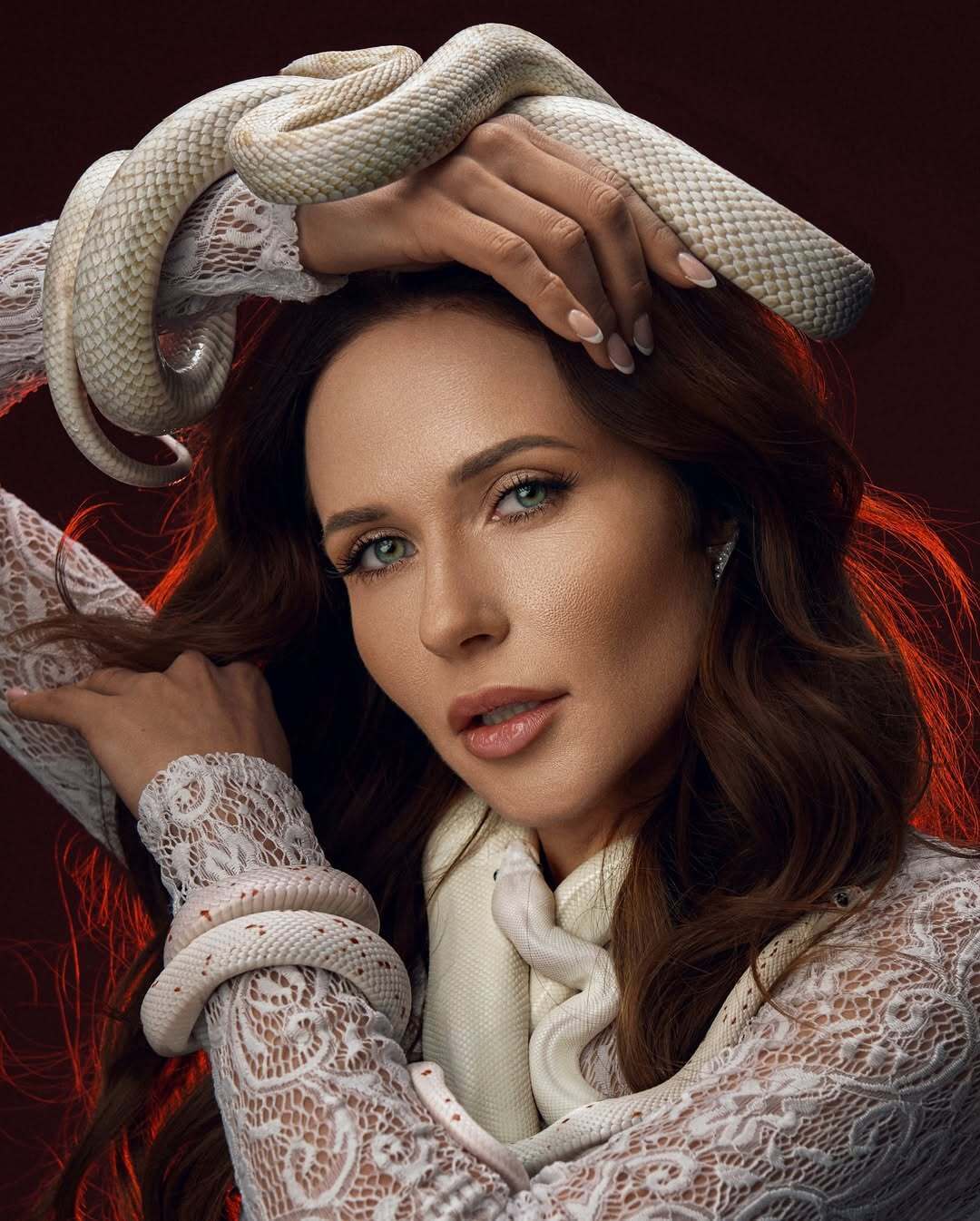 На снимках, которые Денисенко разместила в посте, она позировала с белыми змеями. Те ползали по телу актрисы, обвивая ее шею и касаясь лица.