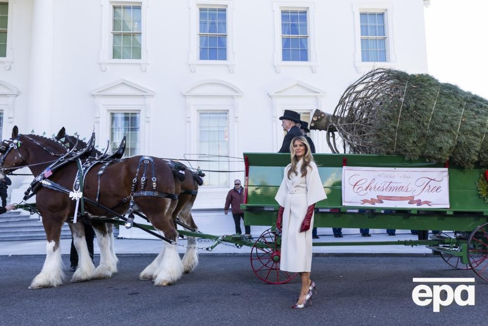 Появилась жена президента США в белом пальто, клетчатой обуви на каблуке и бордовых перчатках. Перед тем как вернуться в свои апартаменты, 55-летняя Мелания Трамп позировала для папарацци на фоне привезенной из штата Мичиган восьмиметровой елки.