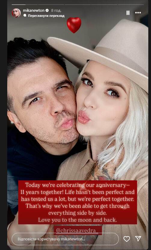Проживающая в США украинская певица Мика Ньютон 11 лет назад познакомилась с американским бизнесменом Крисом Сааведрой. Об этом она сообщила 28 мая в Instagram Stories.
