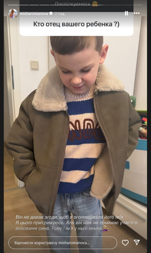 Украинская певица Миша Романова 18 января в Instagram Stories высказалась об отце своего сына Мартина.