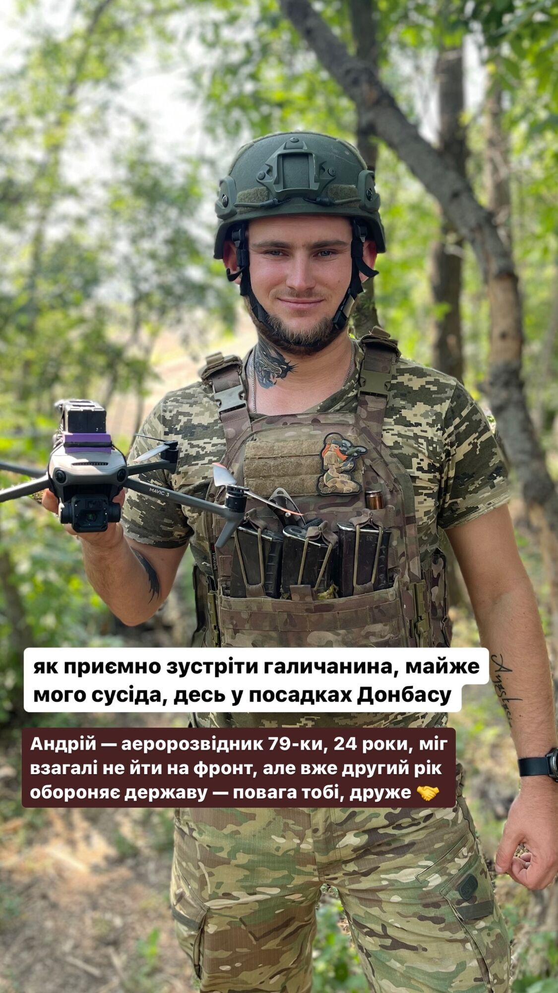 "Андрей – аэроразведчик 79-ки, 24 года. Мог вообще не идти на фронт, но уже второй год обороняет страну. Уважение тебе, друг", – добавил телеведущий и защитник Украины.